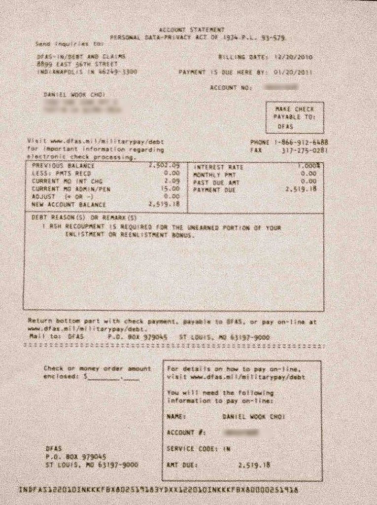Today I received a $2,500 bill from your Defense Department Finance and Debt Services. Specifically, you claim payment for “the unearned portion” of my Army contract. Six months after my discharge under the Don’t Ask Don’t Tell policy I have tried to move forward with my life, and I was inspired by your clarion calls for our progress as one nation towards a more just society. I have served my country in combat and I have tried to live my life by the values I learned at West Point in continued service to our nation. To move forward in my own life I have finally sought treatment for Combat Post Traumatic Stress Disorder (PTSD), Military Sexual Trauma (MST), Insomnia, and Depressive Disorder from the Veterans Affairs Department. But I still find myself on a domestic battlefield for basic dignity as an American citizen. I know I am not alone in this fight because of the desperate cries for help I get from discharged, unemployed, discriminated, and suicidal veterans. I have felt all of their same pains personally. Today I also witness the disgrace of a country that perpetually discovers methods to punish its own citizens for taking a moral stand.