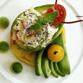 Heat oven to 400*.  Mix crabmeat, celery, eggs, pimiento,onion, 1/2 teaspoon salt and the mayonnaise.  Cut unpeeled avocados lengthwise in half;  remove pits.  Brush halves with lemon juice; sprinkle lightly with salt.