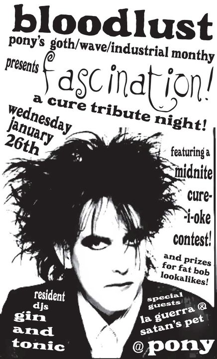 Dust off your heavy duty black mascara wand and start channeling your inner angst...Pony is hosting their monthly goth/wave/industrial night known as Bloodlust, with tonight’s tribute to everyone’s favorite Goth band, The Cure. They’re calling their little soiree, “Fascination” and it’s happening tonight, Wednesday, January 26 with special guests La Guerra and Satan’s Pet and resident DJ’s Gin and Tonic. Oh, and they’ll be a fabulous Midnight Cure-i-oke Contest with wonderful prizes for Fat Bob lookalikes. I”m feeling moody and rebellious already.