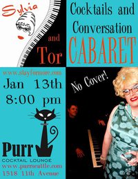 Sylvia O’Stayformore and her musical partner Tor have been performing their cabaret act all over town for the last few months: the Orient Express in Sodo, venues in West Seattle and on Open Circle Theater in Belltown. Tonight, they bring their “Cocktails and Conversation” show to Purr on Capitol Hill for an evening of music, booze and stylish conversation and it starts at 8pm tonight. There’s no cover, (We always like that!) and you can always expect a good time from the duo. If you’re hanging out on the Hill for this month’s Capitol Hill Artwalk, pop on by.