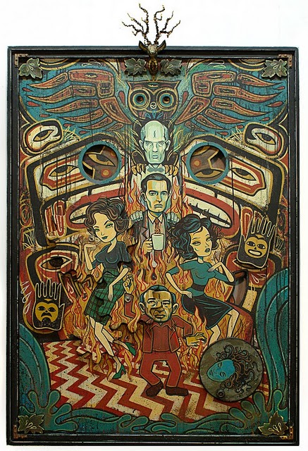 Uh, SEATTLE is Twin Peaks country…why didn’t someone around here think of this? It’s a brilliant idea. “In The Trees: Twin Peaks 20th Anniversary Art Exhibit” was on display in Los Angeles at the iconic Clifton’s Cafeteria in downtown L.A. last weekend for one weekend only, sadly. It featured work by major artists like Glenn Barr, Tim Biskup, Paul Chatem, Elizabeth McGrath and pieces from Twin Peaks creator David Lynch, (also an acclaimed artist) and actors Richard Beymer and Grace Zabriskie.