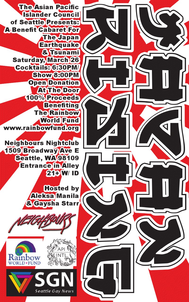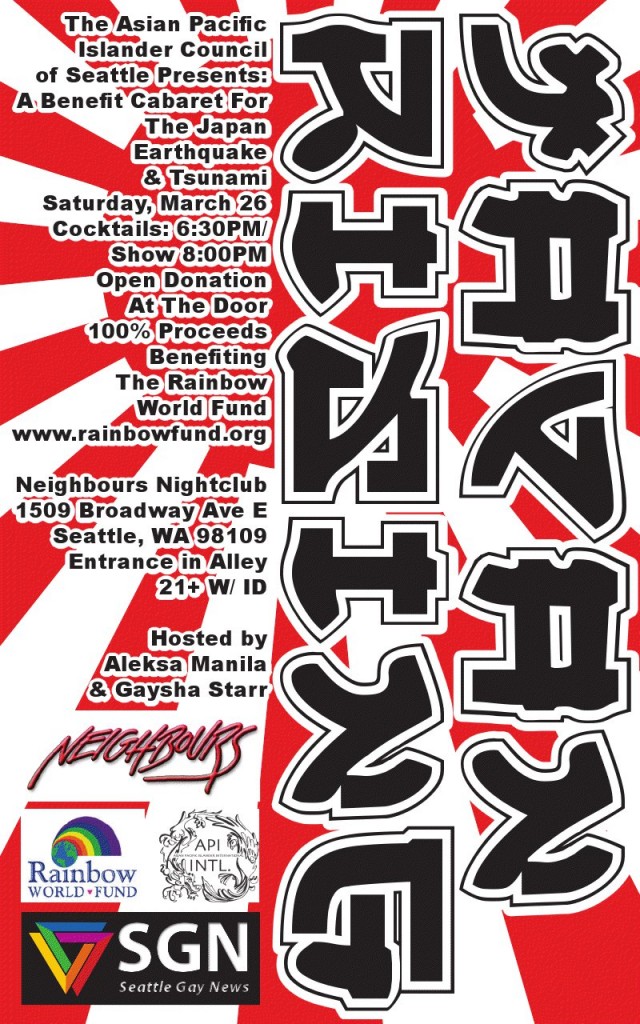 If you’re looking for entertainment this weekend and you’re available after the opening of Rocky Horror Show at Open Circle Theater, then clear way for a benefit at Neighbors Nightclub. On Saturday, March 26, 2011 the Asian Pacific Islander Council, in association with Seattle Gay News, presents: Japan Rising, a benefit cabaret for Japan Earthquake and Tsunami victims. 100% of the proceeds benefit the Rainbow World Fund. Doors open at 6:30pm and the cabaret kicks off at 8:00pm. Three organizations gathered to put on this fundraiser last Friday, after the recent earthquake and tsunami that occurred in Japan. The API Council of Seattle, SGN and Neighbours Nightclub are joining resources to help raise money and awareness through a cabaret show. Here’s what the two lovely co-hosts of the event have to say about why it’s important to help the people of Japan in their hour of need: