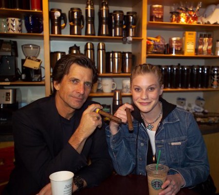 This is so….meta. We have Battlestar Galactica’s ORIGINAL Starbuck, actor Dirk Benedict posing with the rebooted BG Starbuck, actress Katee Sackhoff sitting in a Starbucks cafe while drinking a delicious Starbucks coffee beverage and smoking some stogies.