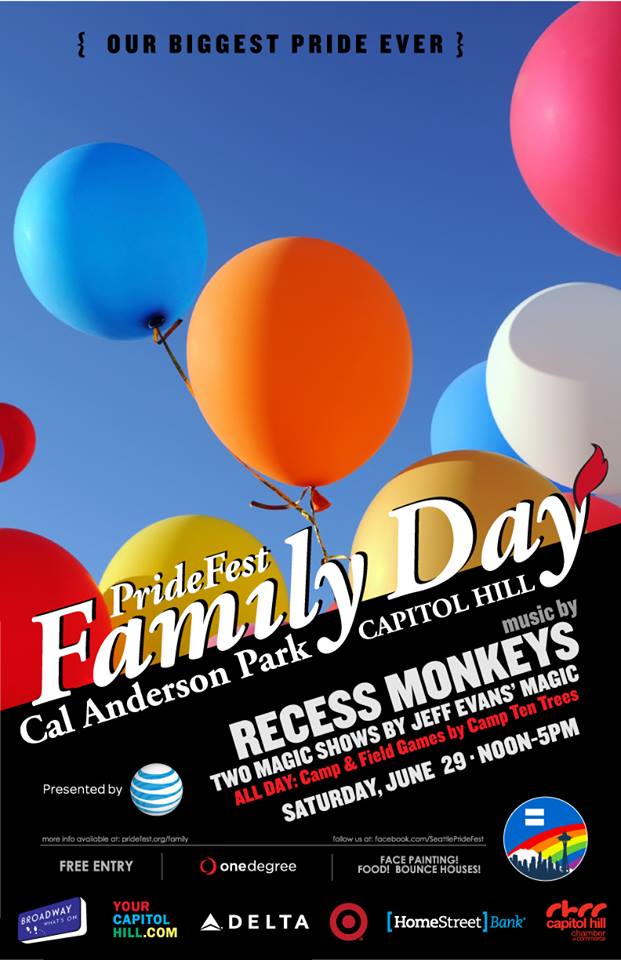 Meanwhile, over at Cal Anderson Park, there’s a couple different events going on. First up, the Seattle PrideFest folks have created an awesome and FREE family event, PRIDEFEST FAMILY DAY from Noon to 5pm..here’s the skinny: