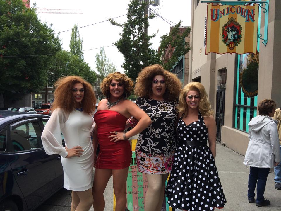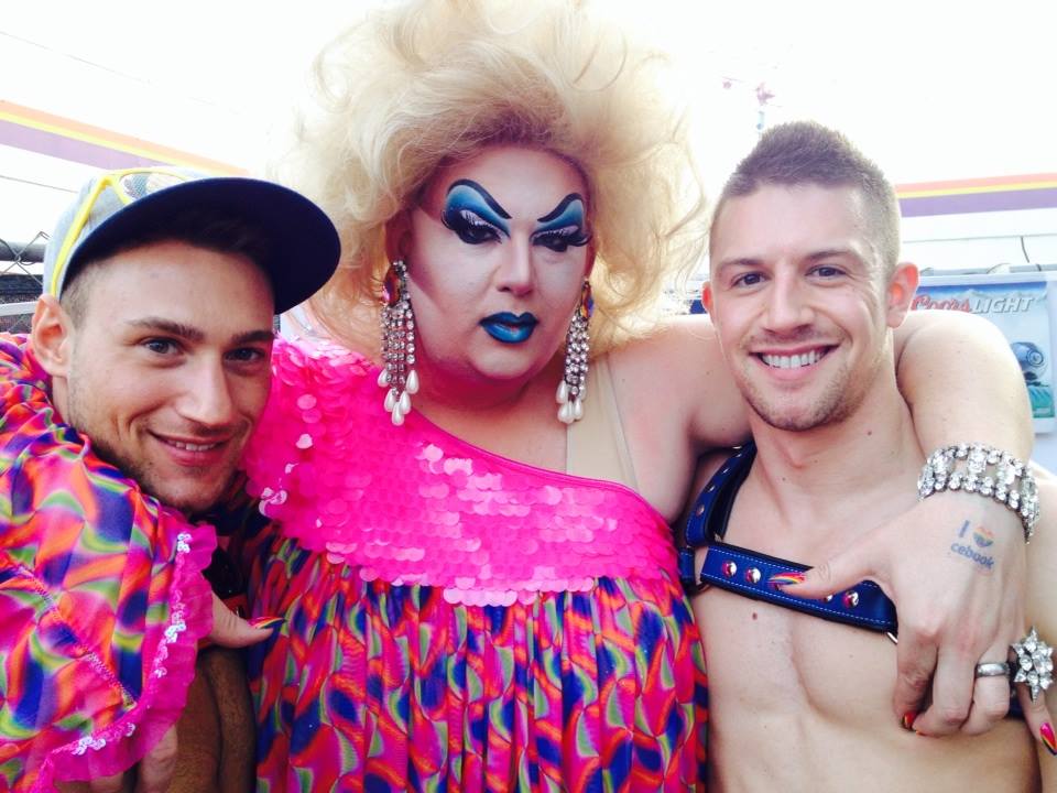 Mama Tits can be seen posing for the camera with Chad Michael and Seattle’s #PushyBottom Alexander Manila at The Cuff’s 2014 Pride Block Party