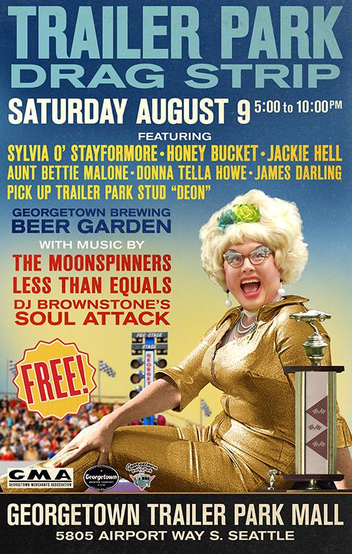 Get “trashed” with Sylvia O’Stayformore and her Pals at the Third Annual Georgetown Trailer Park Drag Strip Show happening at the Trailer Park Mall down in Georgetown, 5805 Airport Way S. (Note: it’s a bit tricky to find…it’s just OFF of Airport Way South….follow the garish lights,vulgar music and cheap floozies/carnies that will be heading that general direction…) The evening kicks off with LIVE musical entertainment at 6pm followed by Drag Queen antics at 8pm with your hostess Sylvia O’Stayformore and her line-up of fabulously talented cooch dancers, er, dragstars including the Queen of Cheap Hookahs, Miz Honey Bucket!