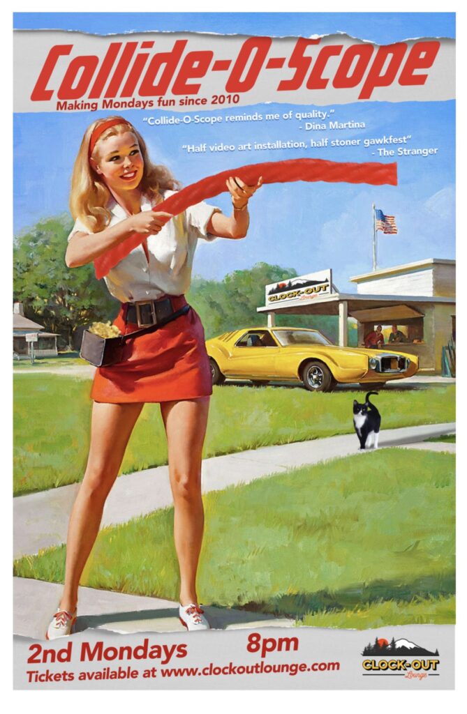 www.collideoscopeseattle.comFor 16 years, Collide-O-Scope has been slaying Seattle audiences with its singular brand of entertainment keenly curated vintage video, freaky film, found-footage fun, all masterfully woven into hilariously mind-melting montages. An expertly crafted fantasia of sight and sound, packed with absurd pop culture ephemera, obscure oddities, and awesome music, all remixed and mashed into epic entertainment that only the editing wizards of Collide-O-Scope could provide. Perfect for stoners, drinkers, thinkers, and all seekers of the unusual. This hosted event also features fabulous free prize drawings throughout the night! For a decade, Collide-O-Scope had its home at Seattle’s beloved Re-bar, until 2020, when they took the show online while the world worked some stuff out. Re-emerging in 2022, they made The Here-After (at The Crocodile) their home for the next four years. Now, celebrating their 16th anniversary, Collide-O-Scope has landed right here at Clock-Out Lounge, and YOU can see them HERE every 2nd Monday!