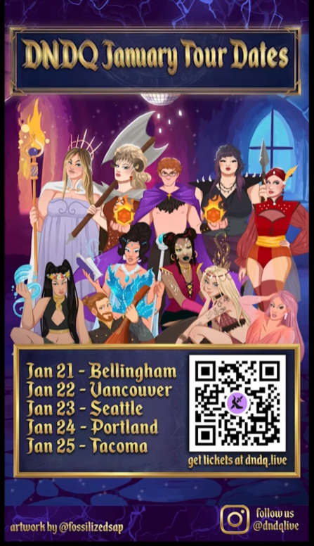 Stuff to do in January if you’re a Dungeons & Dragons player or just a fan…and, even more so if you love the idea of D&D being played by drag queens who may just burst into a lip sync number during a campaign. Yes, it’s DUNGEONS AND DRAG QUEENS LIVE and the hit queer nerd comedy drag show is hitting the road in January for a long weekend of gigs in cities ranging from Vancouver to Portland with stops in Bellingham, Seattle, Tacoma!